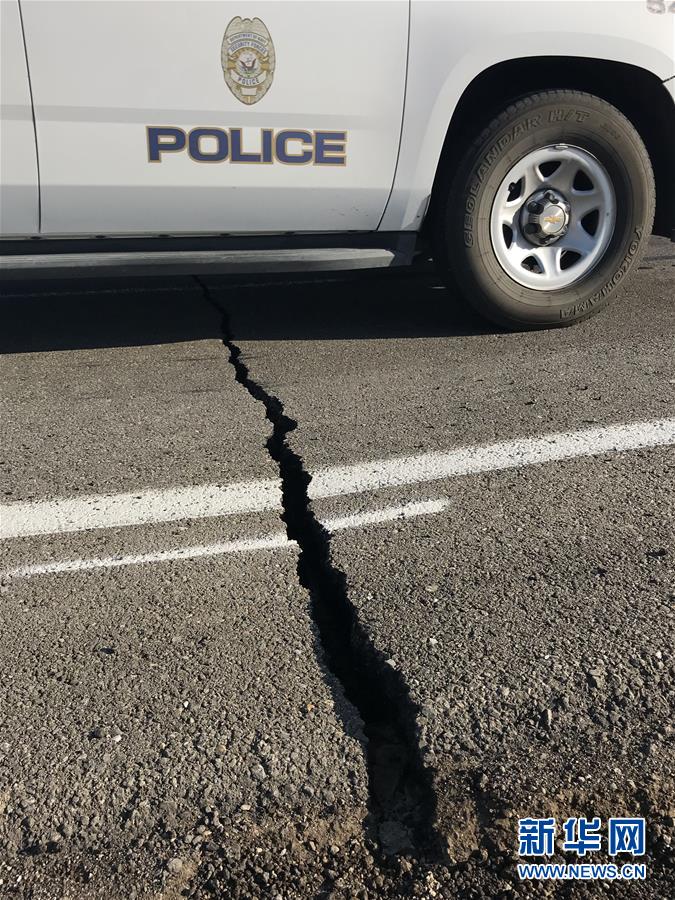 7月6日,在美国加利福尼亚州小镇特罗纳,道路在地震中受损。 美国加利福尼亚州南部地区4日和5日先后发生6.4级和7.1级地震,震中和附近地区遭不同程度破坏。两次强震震中所在地区圣贝纳迪诺县已经进入紧急状态。 新华社发(曾慧摄)