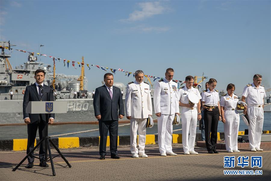 7月7日,乌克兰总统泽连斯基(左一)在乌南部敖德萨港视察“海上微风-2019”联合军演时为死难军人默哀。新华社发(乌克兰总统办公厅提供)