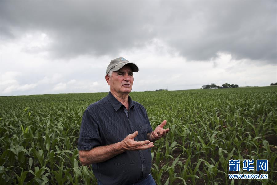 6月18日,在美国艾奥瓦州大西洋镇,农场主比尔·佩雷特在自家的玉米地里接受采访。 新华社记者 王迎 摄