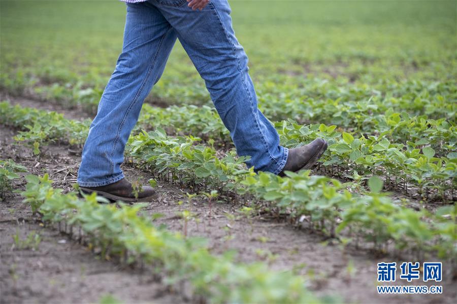 6月18日,在美国艾奥瓦州大西洋镇,农场主比尔·佩雷特的儿子杰伊·佩雷特在自家田地里查看大豆的生长情况。 新华社记者 王迎 摄