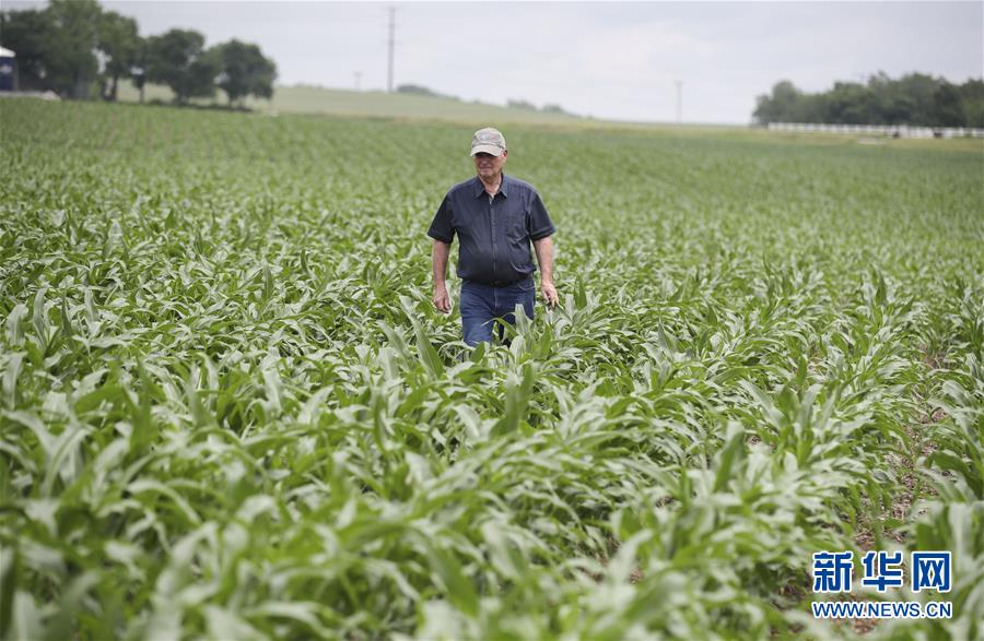 6月18日,在美国艾奥瓦州大西洋镇,农场主比尔·佩雷特的儿子杰伊·佩雷特在自家田地里查看玉米的生长情况。 新华社记者 王迎 摄