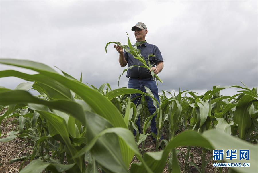6月18日,在美国艾奥瓦州大西洋镇,农场主比尔·佩雷特在自家的玉米地里查看玉米生长情况。 新华社记者 王迎 摄