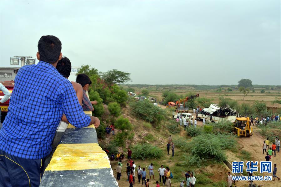 7月8日,在印度阿格拉市附近,人们在事故现场围观。新华社发