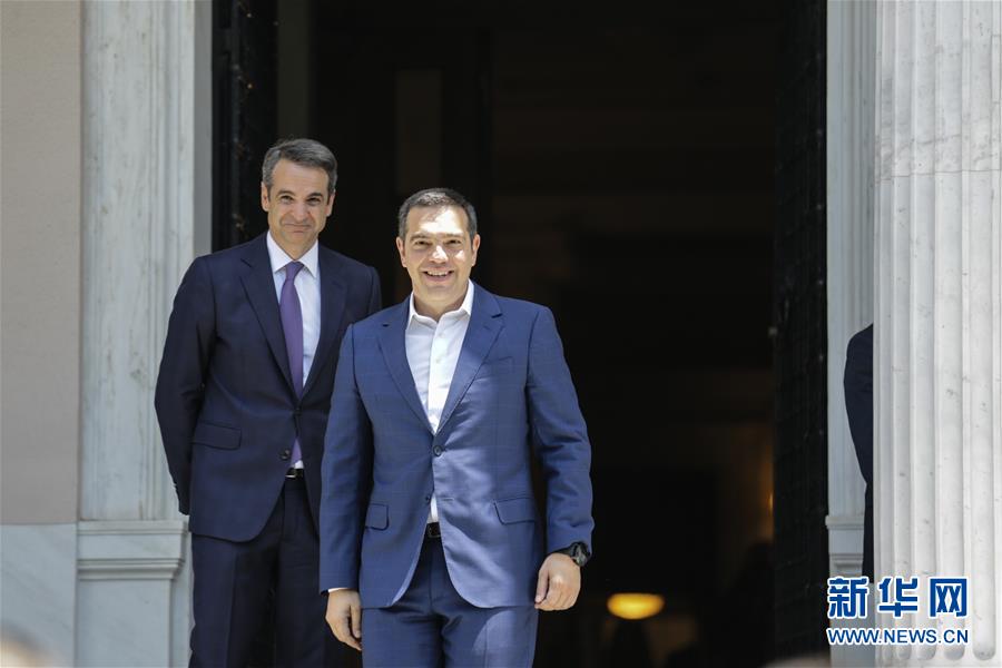 7月8日,在希腊雅典,希腊前总理齐普拉斯(右)在同希腊新总理基里亚科斯·米佐塔基斯交接后,离开总理府。 希腊新总理基里亚科斯·米佐塔基斯8日在雅典宣誓就职,希腊总统帕夫洛普洛斯授权其组建新一届政府。在7日的希腊议会选举中,米佐塔基斯领导的新民主党赢得300个议会席位中的158席。 新华社发(莱夫泰里斯·帕特萨利斯 摄)