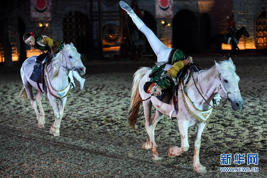 7月8日,在二连浩特市中蒙国际马术演艺基地,蒙古国演员在展示马背技巧。 今年6月至10月,50多名蒙古国年轻演员将在内蒙古自治区二连浩特市的中蒙国际马术演艺基地,为观众演出近百场次的大型马术实景剧。这些演员来自蒙古国野马马术俱乐部,经过几个月的专业培训之后来到中国。在实景剧中,年轻演员们不仅呈现特色民族文化,还展示高超的马术技巧。 2016年,二连浩特当地投入资金,与蒙古国野马马术俱乐部合作,开始打造并试演马术实景剧。三年多来,这一文化演出活动不仅成为了二连浩特市文化旅游的重要组成部分,也促进了中蒙两国民间文化交流。 新华社记者 刘磊 摄