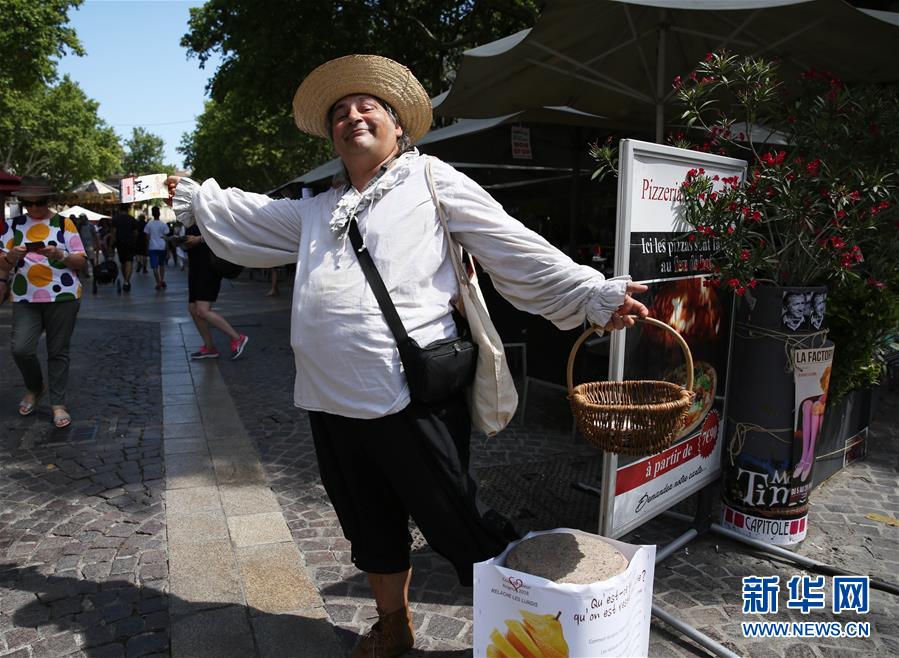 7月8日,在法国阿维尼翁,演员在街头向观众发戏剧宣传单。新华社记者高静摄