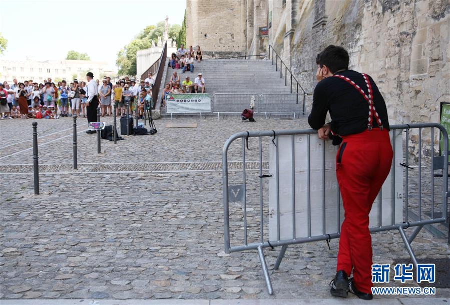 7月8日,在法国阿维尼翁,一名小丑望着在街头表演的同伴。新华社记者高静摄