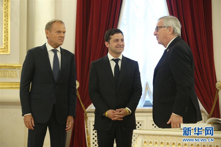 7月8日,在乌克兰首都基辅,乌克兰总统泽连斯基(中)、欧洲理事会主席图斯克(左)和欧盟委员会主席容克在联合记者会前交谈。 新华社发(谢尔盖摄)
