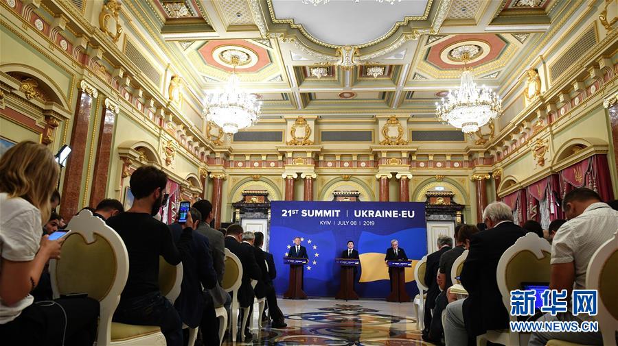 7月8日,在乌克兰首都基辅,乌克兰总统泽连斯基、欧洲理事会主席图斯克和欧盟委员会主席容克出席联合记者会。 新华社发(乌克兰总统办公厅供图)