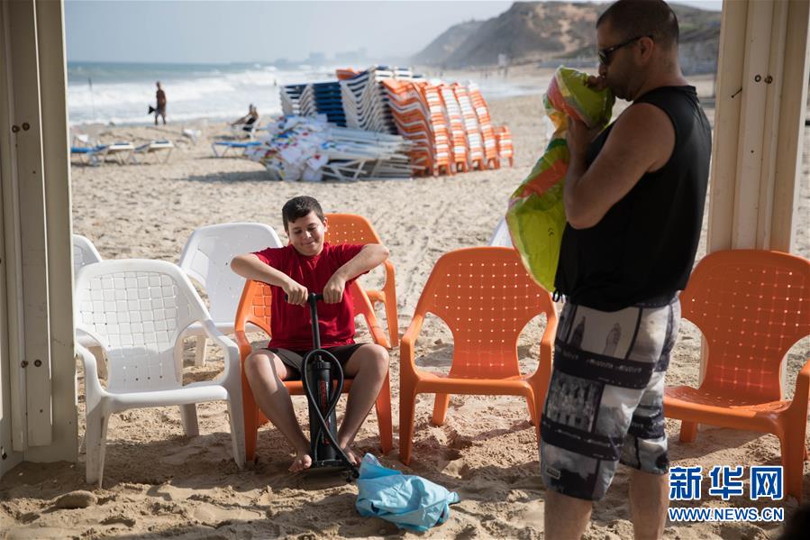 7月8日,在以色列特拉维夫,以色列志愿者为巴勒斯坦儿童准备救生圈。 新华社记者 郭昱 摄
