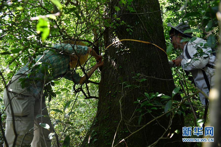 6月27日,在江西婺源县晓起村附近的树林,刘莎莎(左)和助手刘逸康测量树木。 新华社记者 张瑞琪 摄