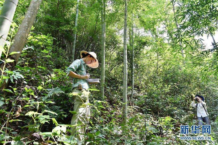 6月27日,在江西婺源县晓起村附近的树林,刘莎莎(左)记录采集到的数据。新华社记者 孙瑞博 摄