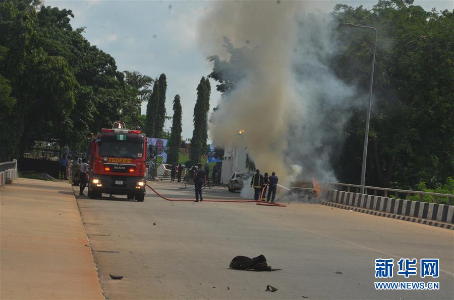 7月9日,在尼日利亚首都阿布贾,消防人员为一辆着火的汽车灭火。 新华社发(奥巴萨摄)