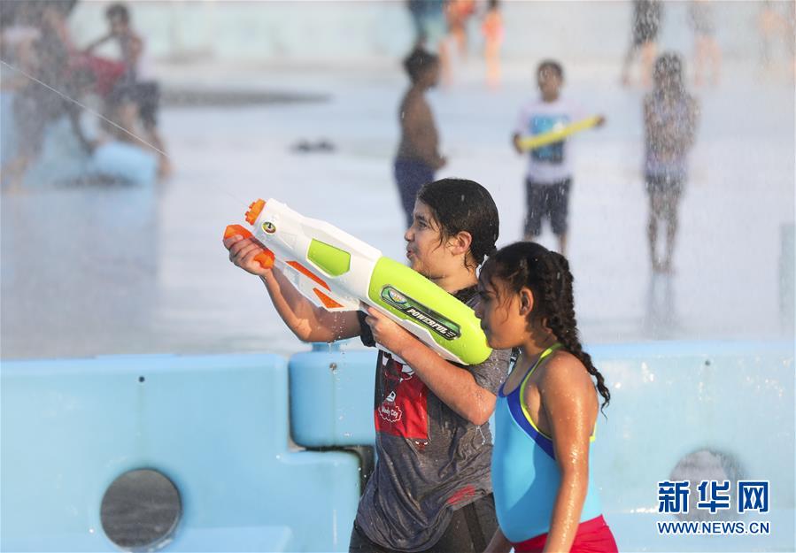 7月9日,在美国纽约,孩子们在科罗纳公园的喷泉戏水。 夏季来临,纽约的喷泉、水池吸引许多民众戏水消暑。 新华社记者 王迎 摄