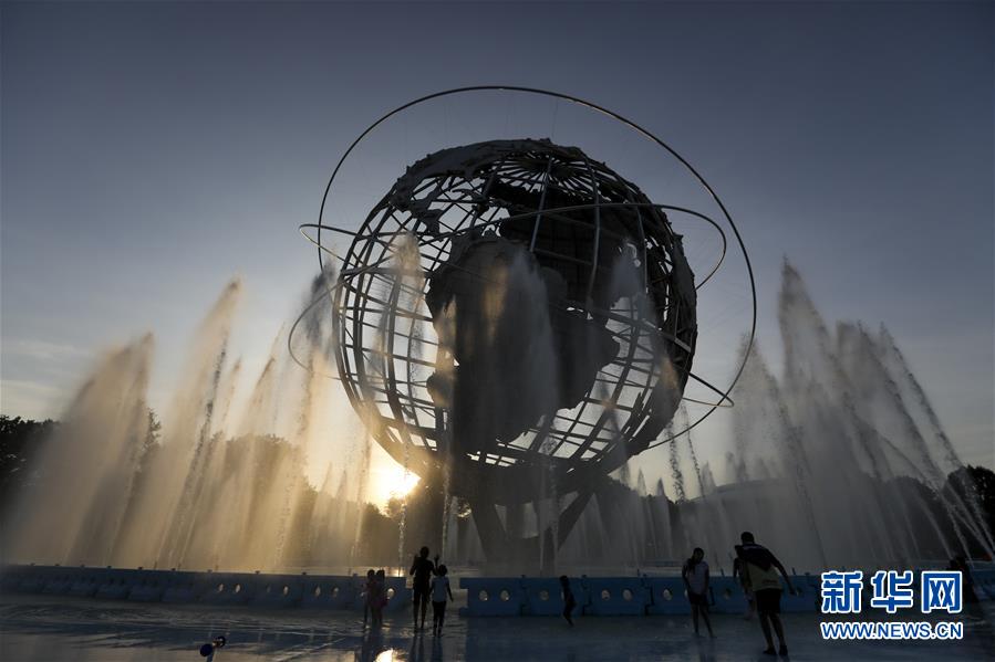 7月9日,在美国纽约,人们在科罗纳公园的喷泉旁玩耍。 夏季来临,纽约的喷泉、水池吸引许多民众戏水消暑。 新华社记者 王迎 摄