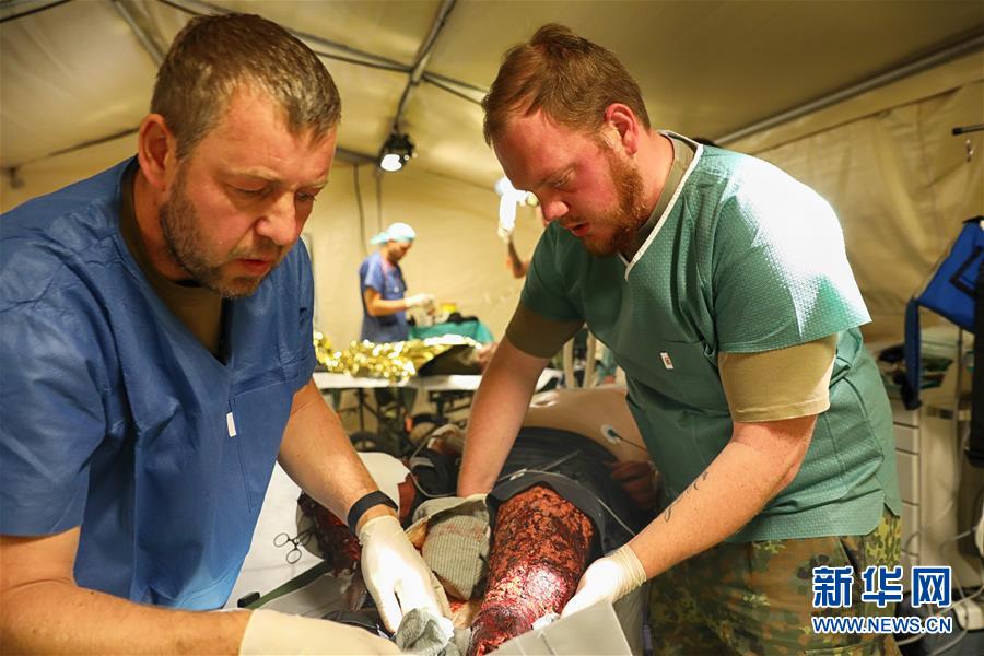 7月10日,在德国费尔德基兴卫勤训练基地,德方野战二级医院医护人员对“伤员”进行紧急处理。新华社记者 琚振华 摄