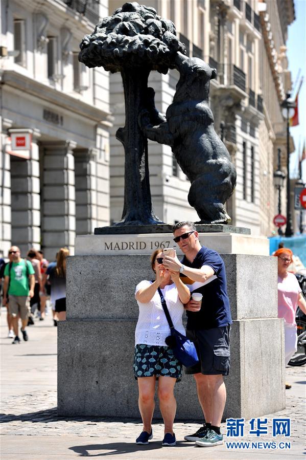 7月11日,在西班牙马德里,两名游客在太阳门广场上的一座雕像前留影。 连日来,西班牙马德里持续高温天气。 新华社记者 郭求达 摄