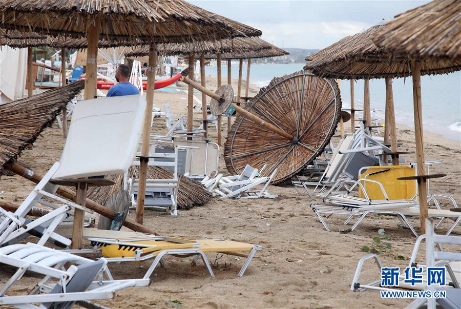 7月11日,在希腊哈尔基季基半岛,一名男子在暴风雨后清理沙滩。新华社发(瓦西利斯 摄)