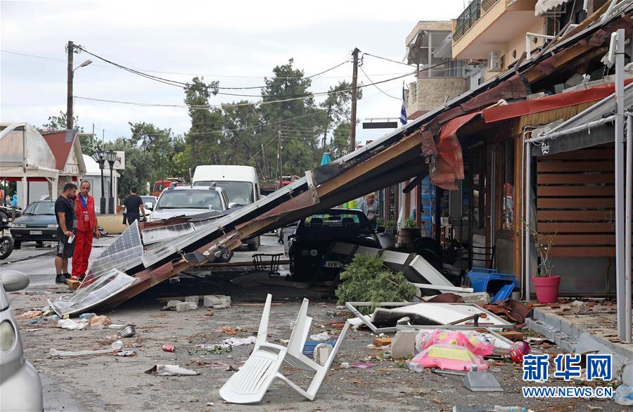 这是7月11日在希腊哈尔基季基半岛拍摄的在暴风雨中损毁的商店。新华社发(瓦西利斯 摄)