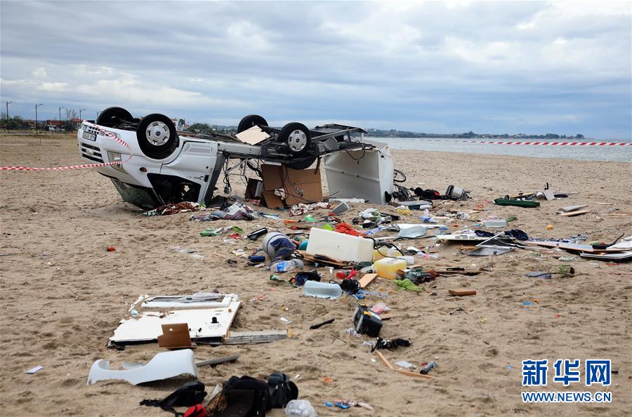 这是7月11日在希腊哈尔基季基半岛拍摄的在暴风雨中损毁的汽车。新华社发(瓦西利斯 摄)