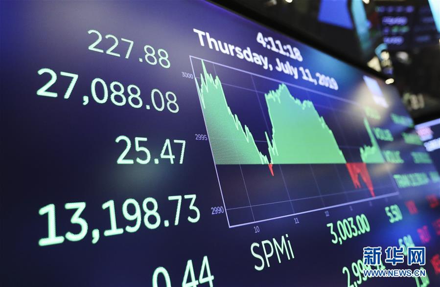 7月11日,美国纽约证券交易所的电子屏显示交易情况。 纽约股市三大股指11日涨跌不一。截至当天收盘,道琼斯工业平均指数比前一交易日上涨227.88点,收于27088.08点,涨幅为0.85%。标准普尔500种股票指数上涨6.84点,收于2999.91点,涨幅为0.23%。纳斯达克综合指数下跌6.49点,收于8196.04点,跌幅为0.08%。 新华社记者 王迎 摄
