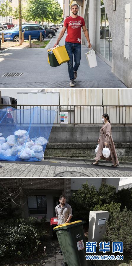 拼版照片显示:7月10日,在奥地利维也纳,当地居民勒布纳前往公寓外的瓶装垃圾点丢弃垃圾(上图,郭晨摄);7月11日,在日本东京,一名女子提着可燃垃圾准备丢弃(中图,杜潇逸摄);7月4日,在澳大利亚悉尼,当地居民邓肯将家中的垃圾箱运到马路边等待当地垃圾回收车处理(下图,白雪飞摄)。