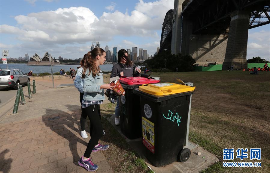 7月4日,在澳大利亚悉尼海港大桥旁,几名青年在分类垃圾箱前投放垃圾。