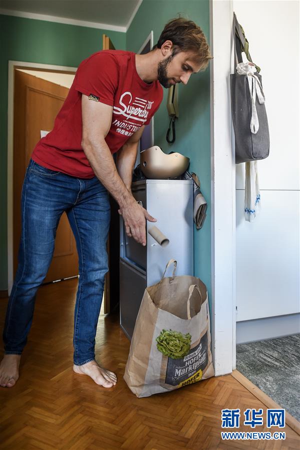 7月10日,在奥地利维也纳,当地居民勒布纳在家中处理废弃纸类垃圾。勒布纳说,一般奥地利人会事先根据垃圾点的分类,在家中设置不同垃圾桶分别收纳垃圾,方便在垃圾点分类丢弃。