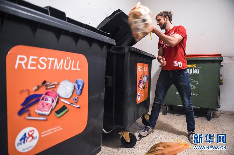 7月10日,在奥地利维也纳,当地居民勒布纳在公寓内的垃圾点投放垃圾。公寓内的垃圾桶也都是分类设置的,必须按照相关分类进行垃圾丢弃。