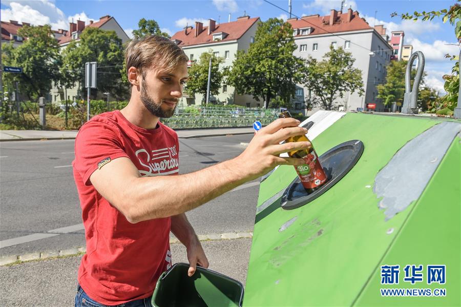 7月10日,在奥地利维也纳,当地居民勒布纳在公寓外的瓶类垃圾点丢弃垃圾。所有瓶类垃圾要按照金属类、塑料类、有色玻璃瓶和无色玻璃瓶的区别分开丢弃。