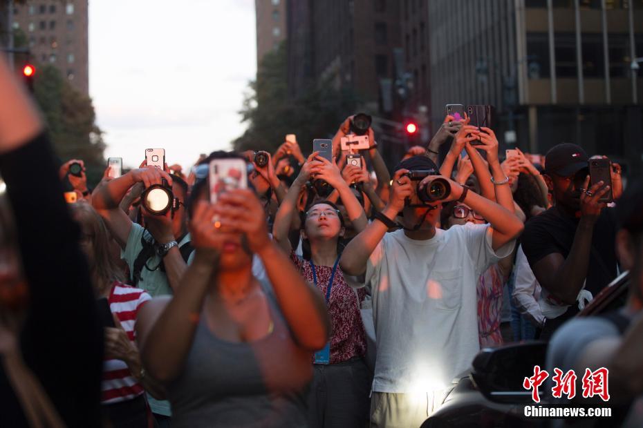 当地时间7月12日傍晚,在美国纽约曼哈顿,大批民众聚集街头观赏、拍摄“曼哈顿悬日”景观。“曼哈顿悬日”是指在美国纽约曼哈顿出现的自然现象,由于曼哈顿街道大多呈棋盘式布局且高楼密集,日落时阳光洒满曼哈顿所有东西向街道的现象每年只出现两次。图为观赏悬日的人群。中新社记者 廖攀 摄