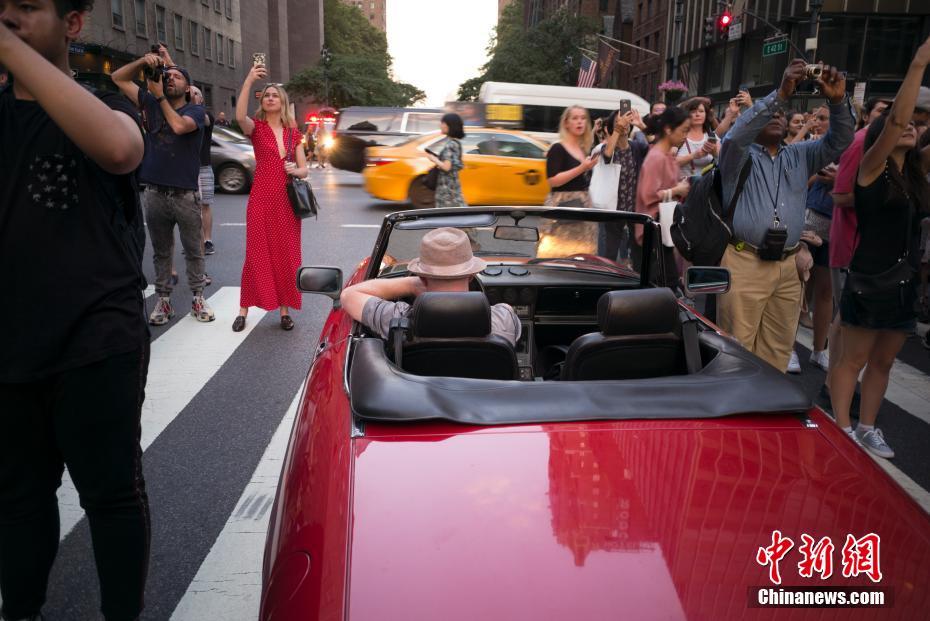 当地时间7月12日傍晚,在美国纽约曼哈顿,大批民众聚集街头观赏、拍摄“曼哈顿悬日”景观。“曼哈顿悬日”是指在美国纽约曼哈顿出现的自然现象,由于曼哈顿街道大多呈棋盘式布局且高楼密集,日落时阳光洒满曼哈顿所有东西向街道的现象每年只出现两次。图为街道上、车辆旁观看悬日的人群。中新社记者 廖攀 摄