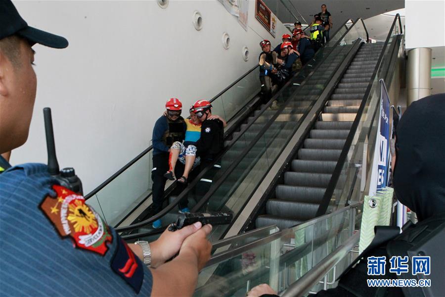 7月13日,在菲律宾曼达卢永,救援人员在反恐演习中转移“伤者”。 当日,菲律宾曼达卢永举行反恐演习,以检验各部门应对恐怖事件的能力。 新华社发(乌马利摄)