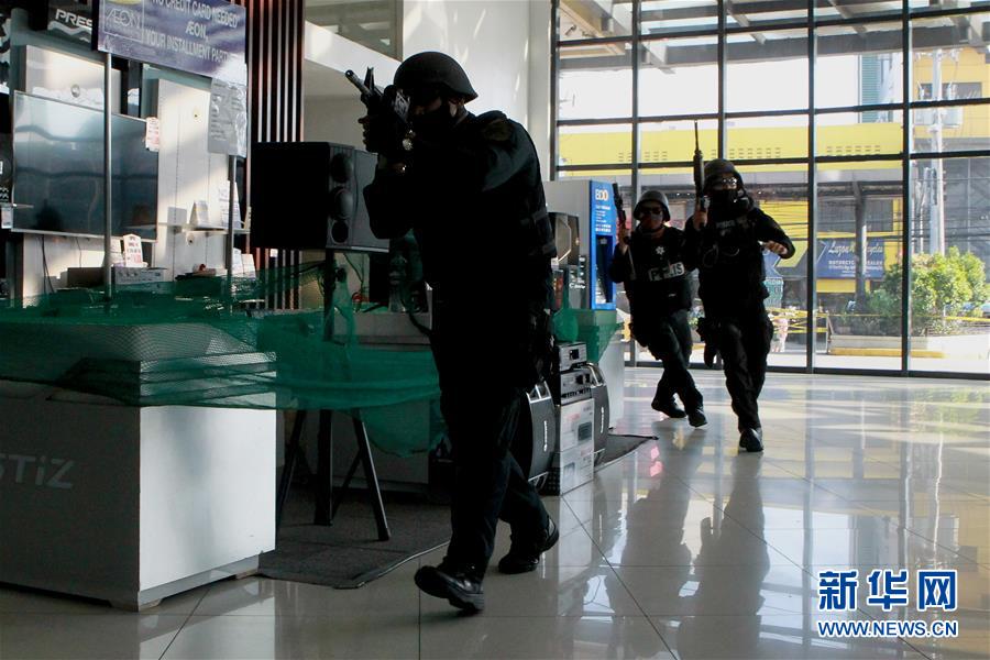 7月13日,在菲律宾曼达卢永,警方人员参加反恐演习。 当日,菲律宾曼达卢永举行反恐演习,以检验各部门应对恐怖事件的能力。 新华社发(乌马利摄)