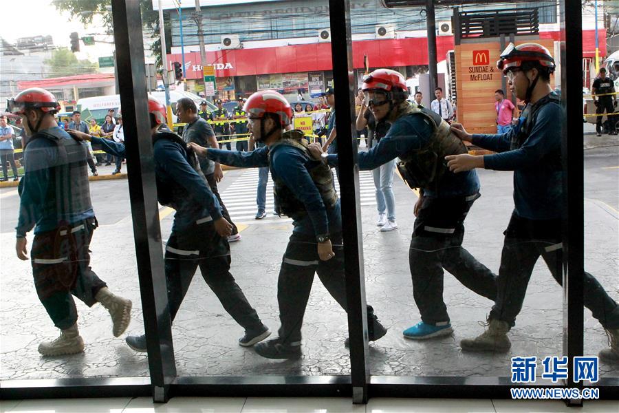 7月13日,在菲律宾曼达卢永,救援人员参加反恐演习。 当日,菲律宾曼达卢永举行反恐演习,以检验各部门应对恐怖事件的能力。 新华社发(乌马利摄)