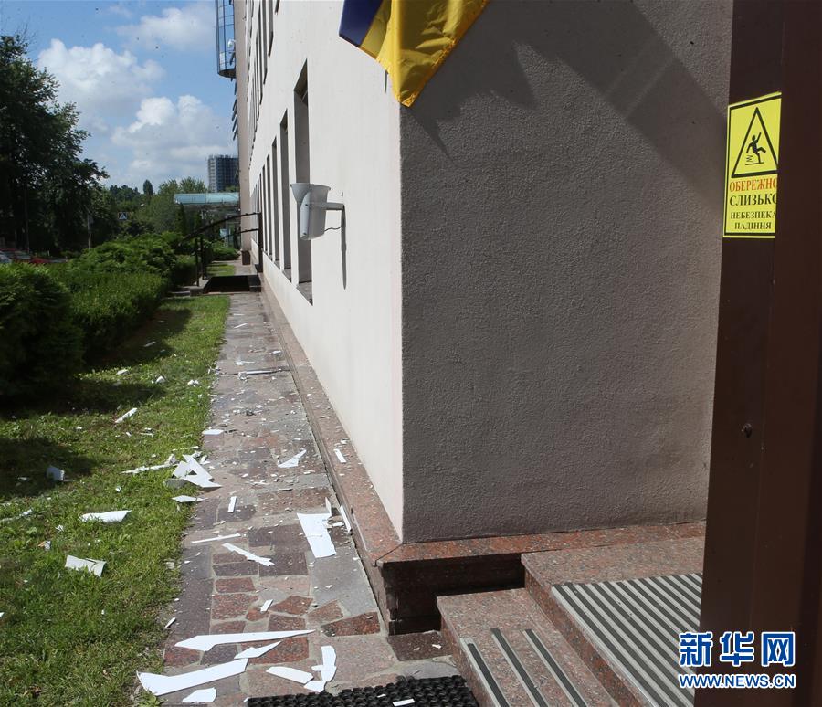 7月13日,在乌克兰首都基辅,遇袭电视台大楼附近散落着受损墙体的碎片。新华社发(谢尔盖摄)