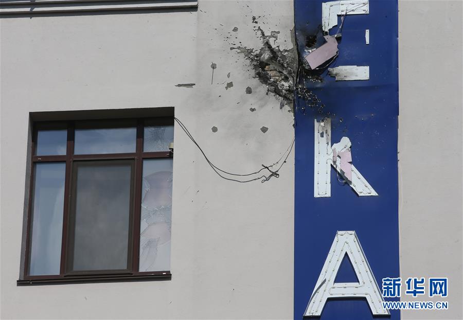 7月13日,在乌克兰首都基辅,遇袭电视台大楼楼体正面受损。新华社发(谢尔盖摄)
