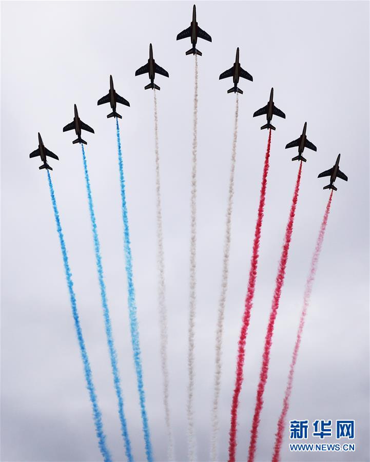 这是7月14日在法国巴黎举行的国庆阅兵仪式上拍摄的“法兰西巡逻兵”飞行表演队。 当日,法国在首都巴黎举行国庆阅兵仪式。 新华社记者 高静 摄