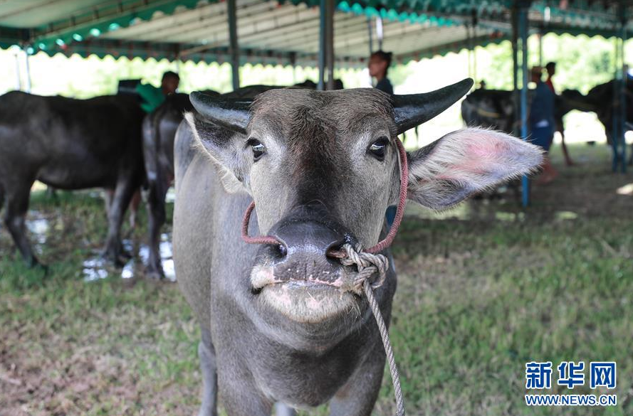 这是7月13日在泰国春武里府赛牛节上拍摄的等待参赛的水牛。新华社记者 张可任 摄