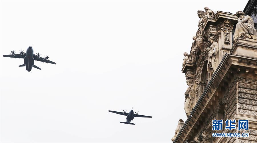 7月14日,在法国巴黎举行的国庆阅兵仪式上,法国空军飞机飞过卢浮宫金字塔广场附近的小凯旋门上空。 当日,法国在首都巴黎举行国庆阅兵仪式。 新华社记者 高静 摄