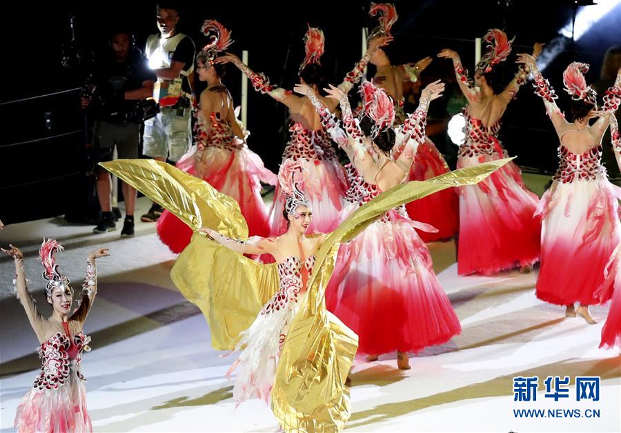 7月14日,演员在闭幕式上的“成都时间”表演。 当日,第30届世界大学生夏季运动会在意大利那不勒斯圣保罗体育场闭幕。 新华社记者程婷婷摄