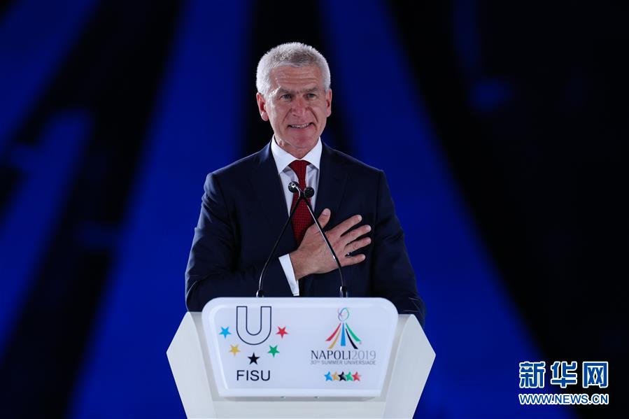 7月14日,国际大学生体育联合会主席奥列格·马迪钦在闭幕式上致辞。 当日,第30届世界大学生夏季运动会在意大利那不勒斯圣保罗体育场闭幕。 新华社记者郑焕松摄