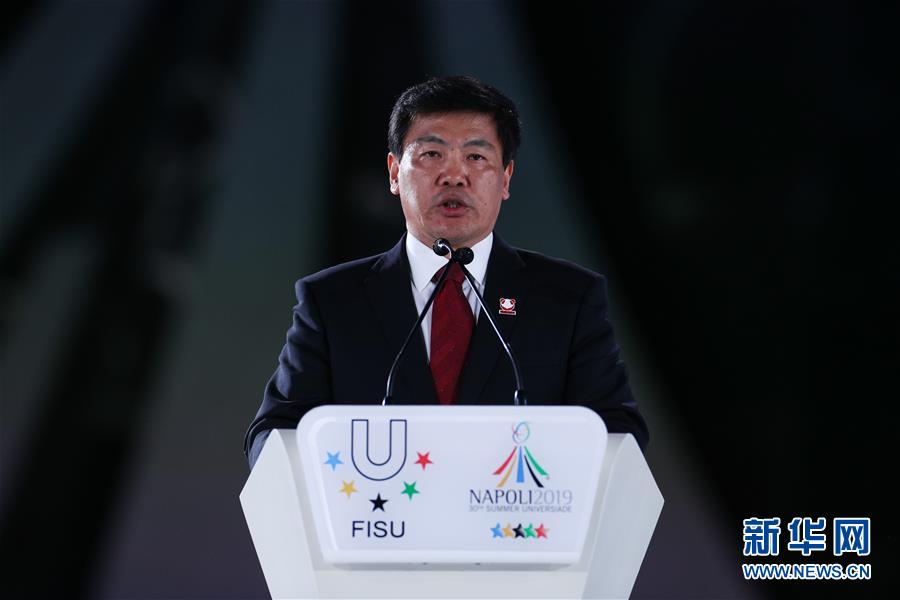 7月14日,下届世界大学生夏季运动会举办城市、成都市市长罗强在闭幕式上致辞。 当日,第30届世界大学生夏季运动会在意大利那不勒斯圣保罗体育场闭幕。 新华社记者郑焕松摄