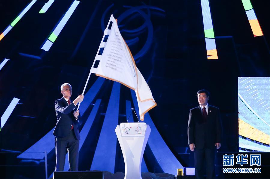 7月14日,国际大学生体育联合会主席奥列格·马迪钦(左)在闭幕式上准备将国际大学生体育联合会会旗交给下届举办城市、成都市市长罗强。 当日,第30届世界大学生夏季运动会在意大利那不勒斯圣保罗体育场闭幕。 新华社记者郑焕松摄