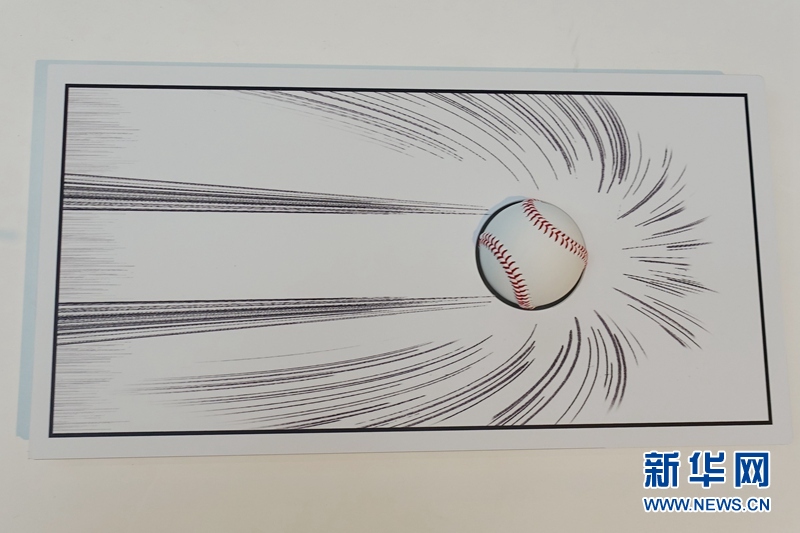 这是7月12日在日本东京“体育X漫画”展媒体预展上拍摄的体验项目之一,观众可将棒球放入漫画孔中,感受体育漫画如何表现球类运动。杜潇逸 摄