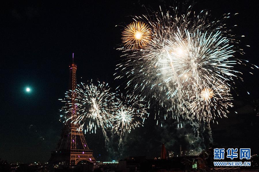 7月14日,在法国巴黎,庆祝国庆日的烟花在埃菲尔铁塔附近绽放。 新华社发(陈寅摄)