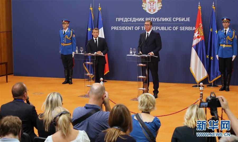 7月15日,在塞尔维亚首都贝尔格莱德,塞尔维亚总统武契奇(右二)与来访的法国总统马克龙(左二)出席新闻发布会。 正在塞尔维亚访问的法国总统马克龙15日说,塞尔维亚为加入欧盟做出不少改变,但欧盟目前没有为吸纳新成员国做好准备。欧盟运转状况不佳,需要通过改革提高决策效率,与塞尔维亚入盟进程相匹配。 新华社发(内马尼亚·恰布里奇摄)