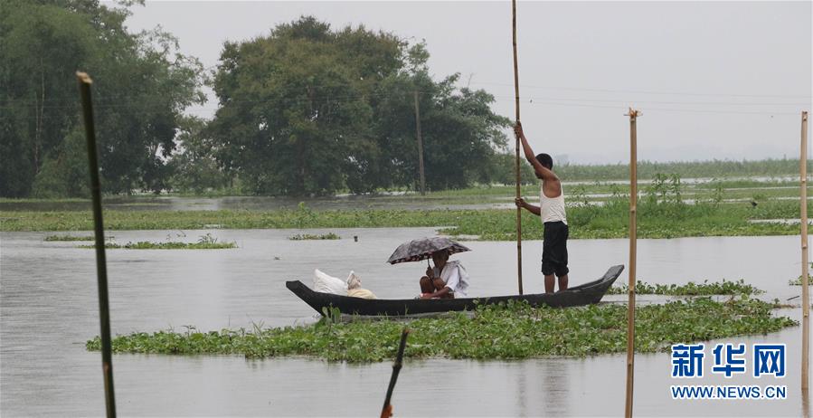 7月15日,在印度东北部阿萨姆邦焦尔哈德,当地居民划船前行。