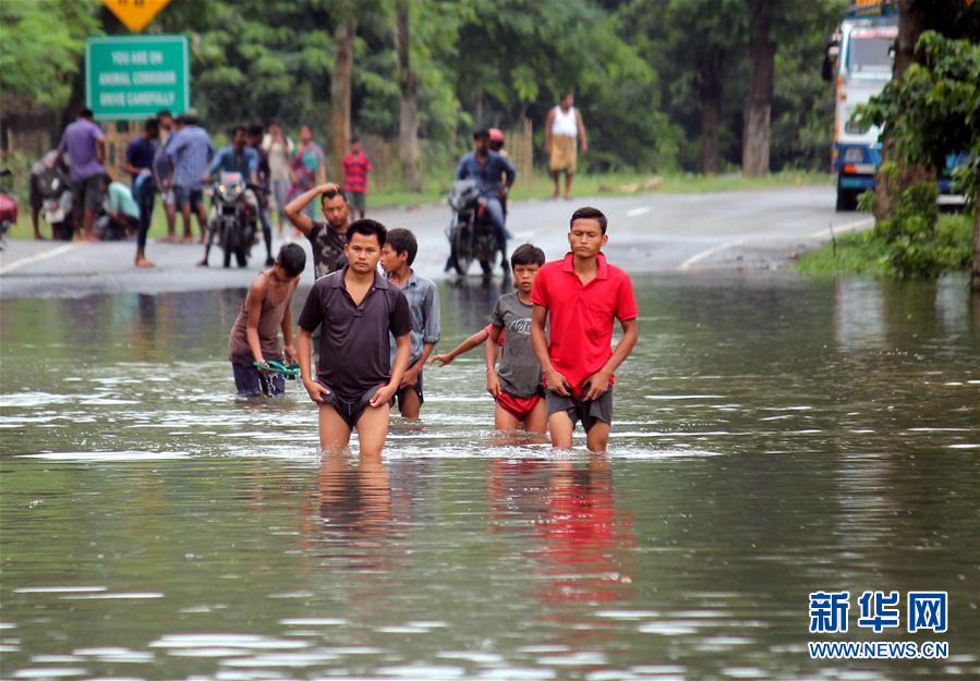 7月15日,在印度东北部阿萨姆邦,当地居民涉水前行。 新华社发
