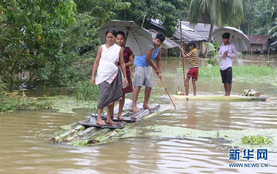 7月15日,在印度东北部阿萨姆邦焦尔哈德,当地居民划木筏前行。新华社发